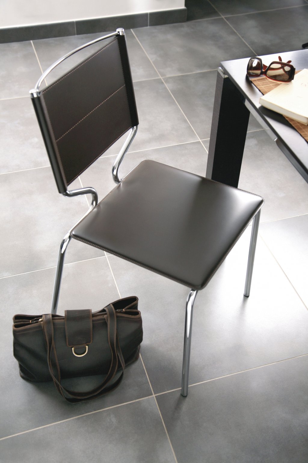- L'assise et le dossier sont revêtus de cuir reconstitué marron.