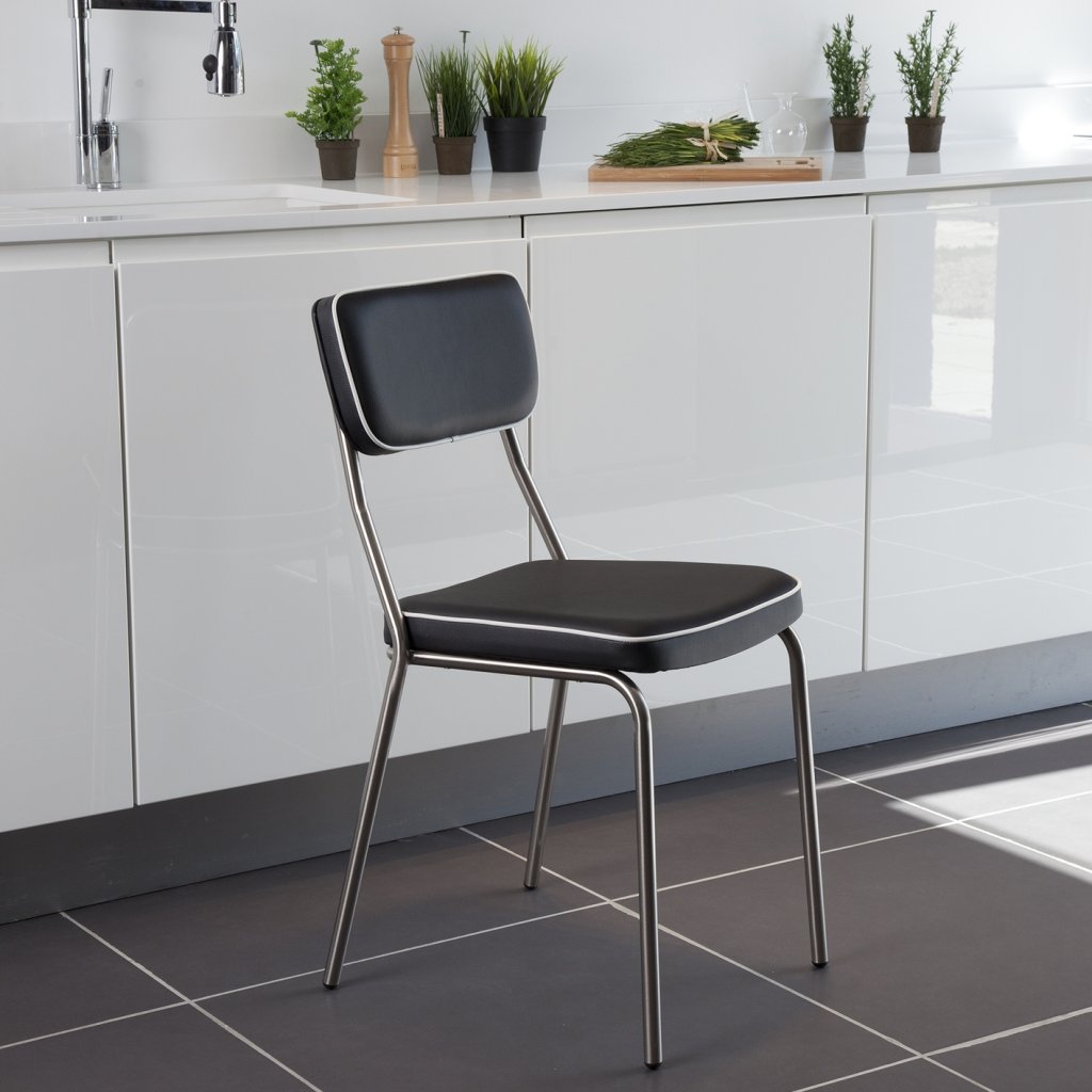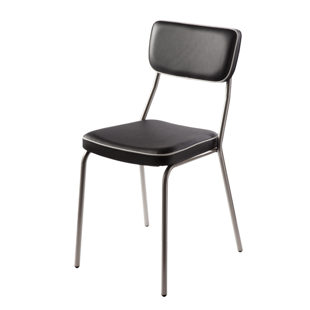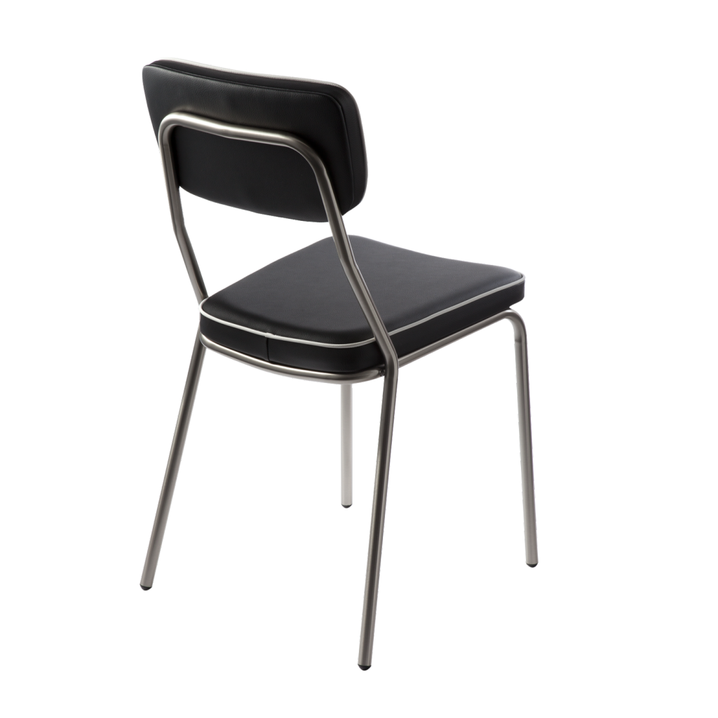 - L'assise et le dossier sont revêtus de tissu simili cuir noir, avec un liseré blanc.