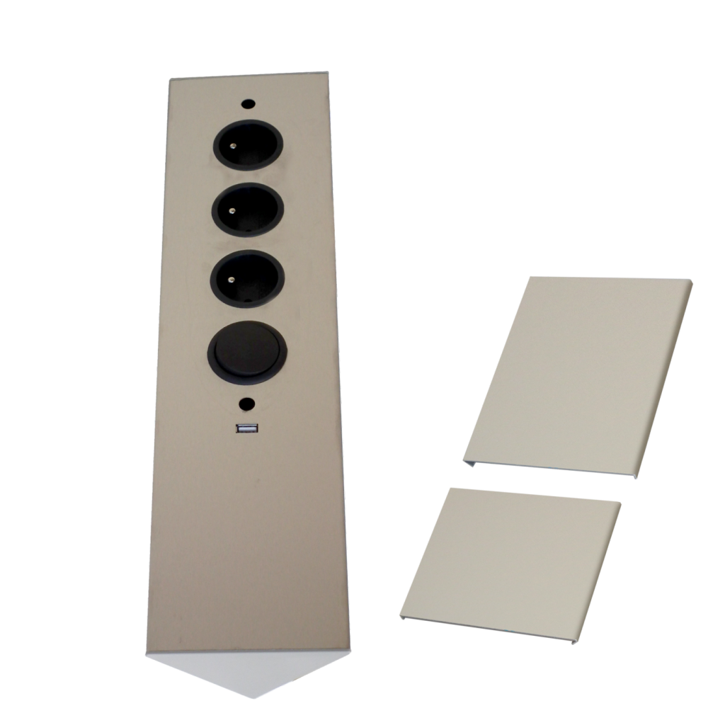 Bloc 3 prises + interrupteur + 1 port USB (0,8A - 5V) d'angle (460 x 115 x 60) livré avec 2 pièces de réglage (H. 90 et 150mm) permettant d'ajuster la hauteur - finition inox brossé - prise noire - 16 A - 230V - 2P+T